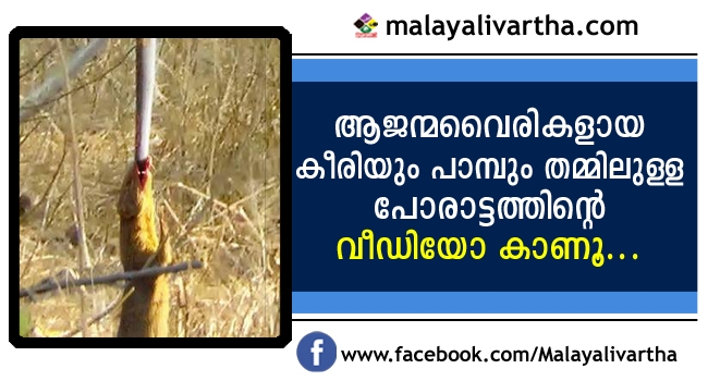 തൂങ്ങിക്കിടക്കുന്ന മാമ്പയുടെ തലയില് കടിച്ചു തൂങ്ങി താഴേയ്ക്ക് വലിച്ചിടാനായിരുന്നു കീരിയുടെ ശ്രമം. ക്ലാസിക് പോരാട്ടത്തില് വിജയം ആര്ക്കൊപ്പമെന്ന് വീഡിയോ ക്ണ്ടിട്ട് തീരുമാനിക്കൂ.