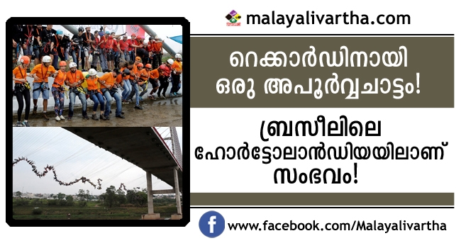 ശരീരത്തില് നീളമുള്ള നൈലോണ് കയര് കെട്ടി മുപ്പത് മീറ്റര് ഉയരമുള്ള പാലത്തിന് മുകളില്നിന്ന് 245 പേര് കൈകോര്ത്തു പിടിച്ച് താഴേക്കു ചാടി റെക്കോര്ഡിട്ടു. ബ്രസീലിലെ ഹോര്ട്ടോലാന്ഡിയയിലാണ് സ്ത്രീകളും പുരുഷന്മാരും അടങ്ങുന്ന സംഘം പാലത്തില്നിന്ന് ഒരുമിച്ചു ചാടി റെക്കോര്ഡിട്ടത്.