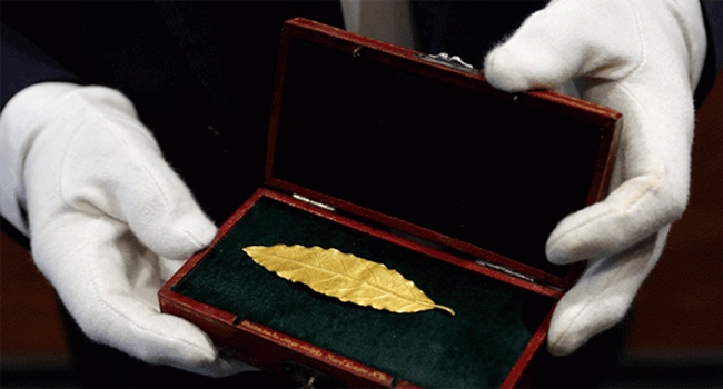 നെപ്പോളിയന്റെ പട്ടാഭിഷേകത്തിന് ഉണ്ടാക്കിയതാണ് ഈ കിരീടം. എന്നാല് കിരീടത്തിന് ഭാരം കൂടുതലാണെന്ന് നെപ്പോളിയന് പരാതിപ്പെട്ടതിനെ തുടര്ന്ന് അതിലെ ആറ് ഇലകള് സ്വര്ണപ്പണിക്കാരന് ഇളക്കി മാറ്റുകയും അത് ആറ് പെണ് മക്കള്ക്കായി നല്കുകയും ചെയ്തിരുന്നു. അതില് ഒരിലയാണ് ഇപ്പോള് ലേലം ചെയ്തിരിക്കുന്നത്.