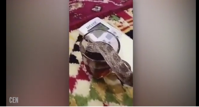 മേശപ്പുറത്തു വെച്ചിരിക്കുന്ന ഗ്ലാസില് നിന്നു ചായ കുടിക്കുന്ന പാമ്പിന്റെ വിഡിയോ ദൃശ്യമാണ് പാമ്പിന്റെ ഉടമ പുറത്തു വിട്ടത്. സാമാന്യം വലിപ്പമുള്ള പാമ്പ് മേശപ്പുറത്തു നീണ്ടുനിവര്ന്ന് കിടന്ന് ഗ്ലാസില് തലയിട്ടാണ് ചായ കുടിക്കുന്നത്. ചായ മാത്രമല്ല വിവിധ ഇനം ജ്യൂസുകളും ഗ്ലാസില് നിന്നു പാമ്പ് കുടിക്കാറുണ്ടെന്ന് ഇതിന്റെ ഉടമയായ താബത്ത് അല് ഫാദി വ്യക്തമാക്കി.