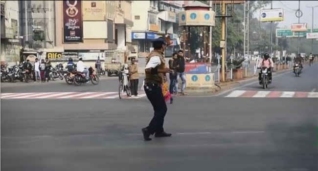 വാഹനങ്ങളുടെ പരക്കം പാച്ചില് വന് അപകടങ്ങള്ക്ക് ഇടയാക്കുന്നത് ഒഴിവാക്കാന് ട്രാഫിക് സിഗ്നല് നിയന്ത്രിക്കുന്നവര് അതീവശ്രദ്ധാലുക്കള് തന്നെ ആവണം. അത്തരം തിരക്കുകള്ക്കിടയില് സമ്മര്ദ്ദങ്ങളൊന്നുമില്ലാതെ വളരെ കൂളായി ട്രാഫിക് നിയന്ത്രിക്കുന്ന ഒരു പൊലീസുകാരനെ കാണാം. മധ്യപ്രദേശിലെ ഇന്ഡോറിലെ ഒരു ട്രാഫിക് പൊലീസുദ്യോഗസ്ഥനാണ് നൃത്തചുവടുകള് വെച്ചു കൊണ്ട് വണ്ടികള് നിയന്ത്രിക്കുന്നത്.