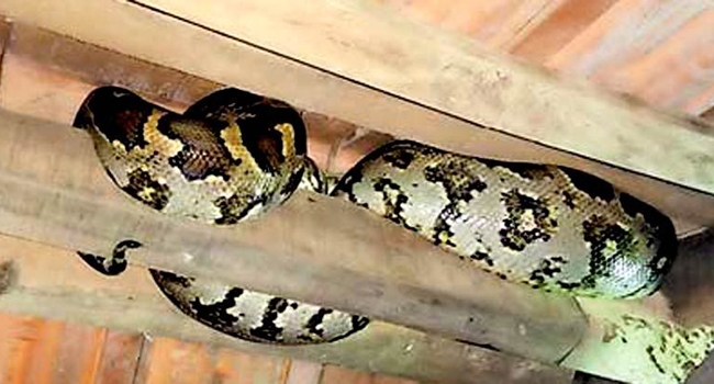 ഓടിട്ട മേല്ക്കൂരയ്ക്കുള്ളില് പതുങ്ങിയിരുന്നത് 18 കിലോ തൂക്കവും എട്ടടി നീളവുള്ള പെരുമ്പാമ്പ്