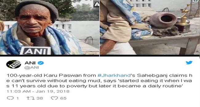 ജാര്ഖണ്ഡിലെ ഒരു നൂറുവയസുകാരന് ആയുസ്സ് നീട്ടിക്കിട്ടാന് കഴിക്കുന്നത് എന്തെന്നറിഞ്ഞാല് ചിലരെങ്കിലും ഞെട്ടും. ദിവസവും ചെളി ആണ് ഇയാള് ഭക്ഷിക്കുന്നത്. കുട്ടിയായിരിക്കുമ്പോള് തുടങ്ങിയ ഈ ശീലം ഇന്നും തുടരുന്നു