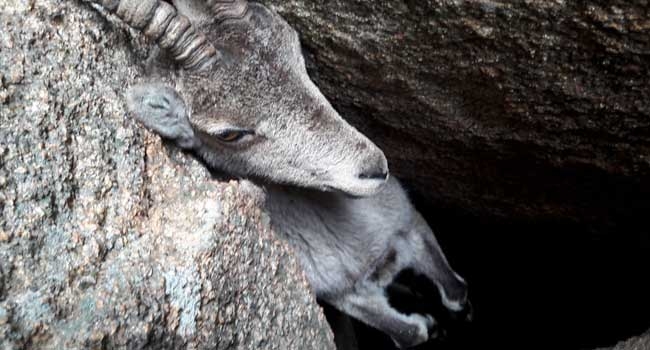 പാറക്കെട്ടുകള്ക്കിടയില് കുടുങ്ങിയ തലയുമായി ആഴങ്ങളിലേക്ക് തൂങ്ങിക്കിടന്ന മലയാടിനെ രക്ഷപ്പെടുത്തി