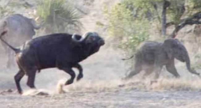 ആനക്കുട്ടിയെ വേട്ടയാടിയ സിംഹക്കൂട്ടത്തെ കാട്ടുപോത്തുകള് നാലുപാടും ചിതറിച്ചു. വേട്ടയാടി ആനക്കുട്ടിയെ പിടിച്ചതിനു ശേഷം കൊന്നു തിന്നാന് ശ്രമിക്കുന്നതിനിടെയാണ് ഒരു കാട്ടുപോത്ത് അവിടേയ്ക്ക് എത്തിയത്. കാട്ടുപോത്ത് എത്തിയതോടെ ഒരു സിംഹം പതിയെ പിന്വലിഞ്ഞു. ദക്ഷിണാഫ്രിക്കയിലെ ക്രൂഗര് നാഷണല് പാര്ക്കിലാണ് സംഭവം.