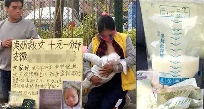 രോഗിയായ മകളുടെ ആശുപത്രി ബില്ലടയ്ക്കാന് ചൈനയില് ഒരമ്മ മുലപ്പാല് വില്ക്കുന്നു. അമ്മയുടെ ചിത്രം സഹിതം ചൈനീസ് സമൂഹമാധ്യമങ്ങളില് വിവരം വ്യാപകമായി പ്രചരിച്ചു. ഇതേത്തുടര്ന്നു രാജ്യാന്തര മാധ്യമമായ ബിബിസി ഉള്പ്പെടെയുള്ളവ ചിത്രം സഹിതം വാര്ത്ത നല്കിയിട്ടുണ്ട്. ചൈനയിലെ ഷെന്ഴെന് മേഖലയിലെ തെരുവില്നിന്ന് എടുത്തിട്ടുള്ള ചിത്രത്തില് കുഞ്ഞിനു മുലപ്പാല് നല്കുന്ന അമ്മയെയും ആശുപത്രിയില് കഴിയുന്ന കുഞ്ഞിന്റെ ചിത്രം പതിച്ച പോസ്റ്ററുമായി നില്ക്കുന്ന അച്ഛനെയും കാണാം.