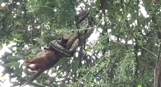 പലതരത്തിലുള്ള ഇരപിടിക്കൽ നമ്മൾ കണ്ടിട്ടുണ്ട്. എന്നാലും പെരുമ്പാമ്പ് ഇര പിടിക്കുന്നത് കാണാൻ ഒരു പ്രേത്യേക രസമാണ്. ഇവിടെയും ഒരു പെരുമ്പാമ്പിന്റെ ഇരപിടിത്തം തന്നെയാണ് സംഭവം. പക്ഷെ ഇദ്ദേഹത്തിന്റെ ഇരപിടുത്തം മരത്തിൽ തൂങ്ങിക്കിടന്നു കൊണ്ടാണെന്നു മാത്രം.