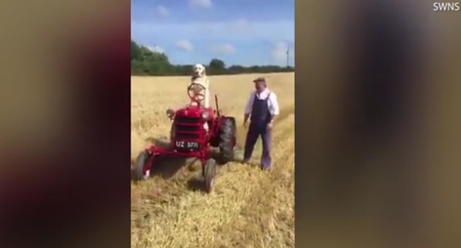 നായ ട്രാക്ടര് ഓടിക്കുന്നതിന്റെ വീഡിയോ കാണാം