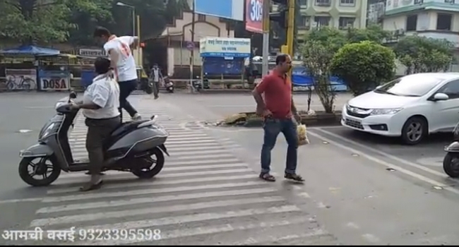 മുംബൈയിലെ വാസൈയിലാണ് സംഭവം. റോഡില് റെഡ് സിഗ്നല് വീണ് കിടക്കുന്ന സമയത്ത് ബൈക്ക് യാത്രകന് സീബ്രാ ലൈനിന് മുകളില് കാല്നട യാത്രക്കാര്ക്ക് പോകാനാവാതെ ബൈക്ക് നിര്ത്തി. പലരും വഴിമാറി നടന്നെങ്കിലും റോഡ് മുറിച്ച് കടന്ന ഒരു യുവാവ് ബൈക്ക് യാത്രികന് പണി കൊടുത്തു. കൃത്യം ലൈനിലൂടെ നടന്ന യുവാവ് ബൈക്കിനടുത്തെത്തിയപ്പോള് മാറി നടക്കാതെ ബൈക്കിന് മുകളിലൂടെ ചവിട്ടിക്കയറി അപ്പുറത്തേക്ക് കടക്കുകയായിരുന്നു.