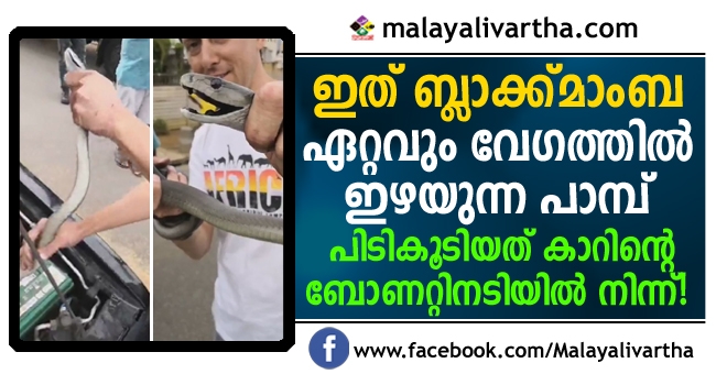 7 അടി നീളമുള്ള ബ്ലാക് മാംബയെ കാറിന്റെ ബോണറ്റില് നിന്നും പിടികൂടി
