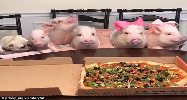 പിങ്ക് ബ്ലാങ്കെറ്റിനുള്ളില് തങ്ങളുടെ ഡിന്നര് പാര്ട്ടിക്കായി ക്ഷമയോടെ കാത്തിരിക്കുകയാണ് പന്നികള്. പാര്ട്ടി തുടങ്ങിയത് പിസയോടെയായിരുന്നു. തങ്ങള്ക്ക് അനുവദിച്ച കക്ഷണം മാത്രമാണ് അവര് കഴിച്ചത്.