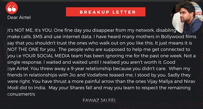 എയര്ടെല്ലിന് ഉപഭോക്താവിന്റെ വക ബ്രെക്ക് അപ് ലെറ്റര്!