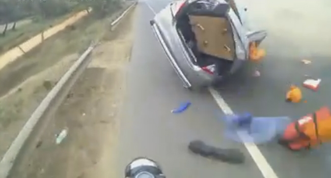 ടയര്പൊട്ടി നിയന്ത്രണം വിട്ട് തലകുത്തി മറിഞ്ഞു വരുന്ന കാറിനു മുന്നില്പ്പെട്ട ബുള്ളറ്റ് യാത്രക്കാരന്! വിഡിയോ കാണൂ