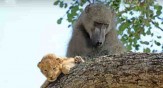 സ്വന്തം കുഞ്ഞിനെപ്പോലെ, തട്ടിയെടുത്ത സിംഹക്കുട്ടിയെ പരിപാലിക്കുന്ന ബബ്ബൂണ്!