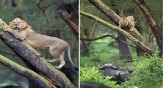 സിംഹത്തിനെ വിരട്ടിയോടിച്ച് മരത്തില് കയറ്റി ആഫ്രിക്കന് എരുമകള്...!