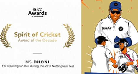 ക്രിക്കറ്റ് താരം എം.എസ് ധോണിയ്ക്ക് സ്ഫിരിറ്റ് ഓഫ് ക്രിക്കറ്റ് അവാര്ഡ് ഓഫ് ദ് ഡീക്കേഡ്. 2011ലെ നോട്ടിങ്ങാം ടെസ്റ്റില് റണ് ഔട്ട് ആയെന്ന് പറഞ്ഞ് തിരികെ നടന്ന ഇംഗ്ലണ്ട് ബാറ്റ്സ്മാന് ഇയാന് ബെല്ലിനെ കൈകാട്ടി തിരികെ വിളിച്ചതിനാണ് ധോണിയ്ക്ക് അവാര്ഡ്.