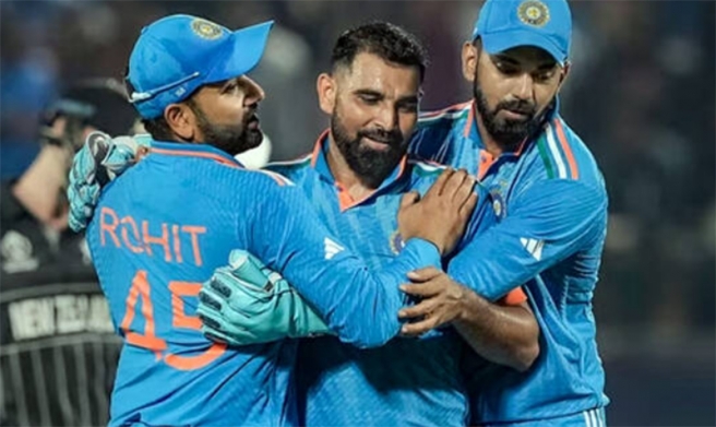 അവസാന ഓവറില് തനിക്കെതിരെ തുടര്ച്ചയായി സിക്സും ഫോറും നേടിയ മിച്ചലിനെ പുറത്താക്കിയാണ് ഷമി 5 വിക്കറ്റ് നേട്ടം സ്വന്തമാക്കിയത്. 127 പന്ത് നേരിട്ട് 9 ഫോറും 5 സിക്സും ഉള്പ്പെട്ടതാണ് മിച്ചലിന്റെ ഇന്നിംഗ്സ്. അവസാന പന്തില് ലോക്കി ഫെര്ഗുസന് (1) റണ്ണൗട്ടായി. ട്രെന്ഡ് ബൗള്ട്ട് (0) നോട്ടൗട്ടായി. ഇന്ത്യയ്ക്കായി ഷമി അഞ്ചും കുല്ദീപ് രണ്ട് വിക്കറ്റും വീഴ്ത്തിയപ്പോള് ബുംറയും സിറാജ് ഓരോ വിക്കറ്റ് വീതം വീഴ്ത്തി.രണ്ട് മാറ്റങ്ങളുമായാണ് ഇന്ത്യന് ടീം കളത്തിലിറങ്ങിയത്. കഴിഞ്ഞ മത്സരത്തില് പരിക്കേറ്റ വൈസ് ക്യാപ്ടന് ഹാര്ദിക് പാണ്ഡ്യയ്ക്കും പേസ് ഓള്റൗണ്ടര് ഷര്ദുല് താക്കൂറിനും പകരം മുഹമ്മദ് ഷമിയും സൂര്യകുമാര് യാദവും അവസാന ഇലവനില് ഇടം നേടി.