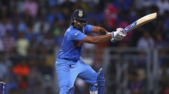 ടോസ് നഷ്ടപ്പെട്ട് ബാറ്റിങ്ങിനിറങ്ങിയ ഇന്ത്യയുടേത് ഭേദപ്പെട്ട തുടക്കമായിരുന്നു. ശിഖര് ധവാന് പകരം ടീമിലെത്തിയ അജിങ്ക്യ രഹാനെയും രോഹിത് ശര്മയും ചേര്ന്ന് ടൂര്ണമെന്റില് ഇന്ത്യയുടെ ആദ്യ ഒന്നാം വിക്കറ്റ് അര്ധസെഞ്ചുറി കൂട്ടുകെട്ട് തീര്ത്തു. 7.2 ഓവറില് ഇരുവരും കൂട്ടിച്ചേര്ത്തത് 62 റണ്സ്. തുടക്കത്തിലെ മെല്ലെപ്പോക്കിന് ശേഷം പതുക്കെ കത്തിക്കയറിയ ഇരുവരും ഇന്ത്യയ്ക്ക് മികച്ച തുടക്കം സമ്മാനിച്ചു. ഇന്ത്യയ്ക്ക് ആദ്യ വിക്കറ്റ് നഷ്ടമായത് എട്ടാം ഓവറില്. 31 പന്തില് 43 റണ്സെടുത്ത രോഹിത് ശര്മയെ സാമുവല് ബദ്രി മടക്കി. മൂന്നു വീതം ബൗണ്ടറിയും സിക്സും ഉള്പ്പെടുന്നതായിരുന്നു ശര്മയുടെ ഇന്നിങ്സ്.