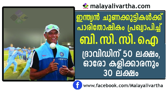 അണ്ടര് 19 ലോകകപ്പ് കിരീടം ചൂടിയതിന് പിന്നാലെ ഇന്ത്യന് ടീമിന് പാരിതോഷികം പ്രഖ്യാപിച്ച് ബി.സി.സി.ഐ. പരിശീകനായ രാഹുല് ദ്രാവിഡിന് 50 ലക്ഷം രൂപ, ഓരോ കളിക്കാരനും 30 ലക്ഷം രൂപ എന്നിങ്ങനെയാണ് ബി.സി.സി.ഐയുടെ പ്രഖ്യാപനം.