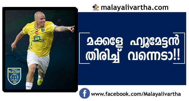 ഐ എസ് എല് ആദ്യ സീസണില് മലയാളക്കരയുടെ ഹൃദയം കവര്ന്ന ഹ്യൂമേട്ടന് വീണ്ടും ബ്ലാസ്റ്റേഴ്സിനായി ബൂട്ട് കെട്ടുന്നു . ഐ എസ് എല്ലിന്റെ നാലാം സീസണില് കളിക്കാന് കേരള ബ്ലാസ്റ്റേഴ്സ് ഇയാന് ഹ്യൂമുമായി കരാറൊപ്പിട്ടു. കേരളാ ബ്ലാസ്റ്റേഴ്സിന്റെ ഔദ്യോഗിക ഫേസ് ബുക്ക് പേജിലൂടെയാണ് ഇക്കാര്യം അറിയിച്ചിരിക്കുന്നത്.കഴിഞ്ഞ ദിവസങ്ങളില് ഡ്രാഫ്റ്റുമായി ബന്ധപ്പെട്ട് ഇയാന് ഹ്യൂം ഇന്ത്യയില് എത്തിയിരുന്നു. അതോടെ ബ്ലാസ്റ്റേഴ്സിന്റെ ആദ്യ വിദേശ താരം ഹ്യൂമായിരിക്കുമെന്ന സൂചനകളും നിലനിന്നിരുന്നു.