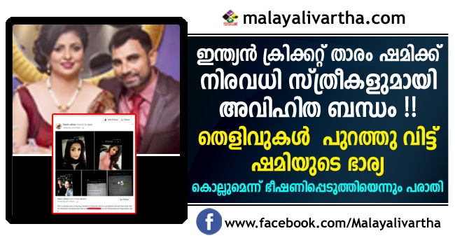 ഇന്ത്യൻ പേസർ മുഹമ്മദ് ഷമിക്കെതിരെ അവി ഹിത ബന്ധം ആരോപിച്ച് ഭാര്യ ഹാസിൻ ജാഹൻ രംഗത്ത്. നിരവധി സ്ത്രീകളുമായുള്ള മുഹമ്മദിന്റെ ബന്ധം ശരിവെക്കുന്ന ചാറ്റുകളുടെ സ്ക്രീൻഷോട്ടുകൾ സോഷ്യൽ മീഡിയയിലൂടെ ഹാസിൻ പുറത്ത് വിട്ടിരുന്നു.