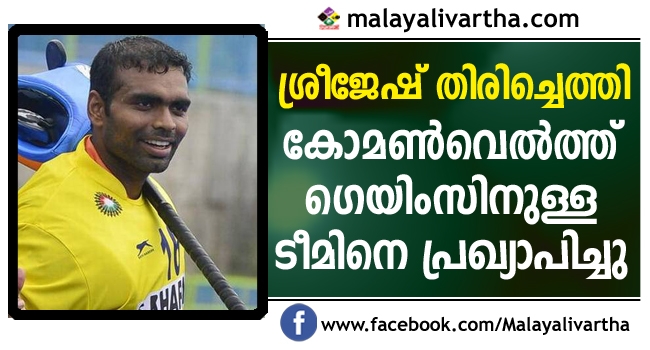 കോമണ്വെല്ത്ത് ഗെയിംസിനുള്ള ഇന്ത്യയുടെ ഹോക്കി ടീമിനെ പ്രഖ്യാപിച്ചു. മലയാളി ഗോള്കീപ്പര് പി.ആര് ശ്രീജേഷ് ടീമിലേക്ക് തിരിച്ചെത്തി. ഓസ്ട്രേലിയയിലെ ഗോള്ഡ് കോസ്റ്റില് നടക്കുന്ന കോമണ്വെല്ത്ത് ഗെയിംസിന് മന്പ്രീത് സിംഗിന്റെ നേതൃത്വത്തില് പതിനെട്ടംഗ സംഘമാണ് പോകുന്നത്.