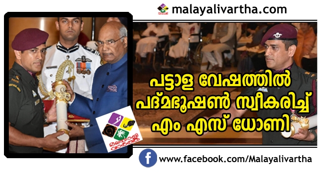 സൈനിക വേഷത്തിലെത്തിയാണ് ധോണി രാഷ്ട്രപതിയില് നിന്നു പുരസ്കാരം ഏറ്റുവാങ്ങിയത്. ടെറിട്ടോറിയല് ആര്മിയില് ലെഫ്റ്റനന്റ് കേണലാണ് മുന് ഇന്ത്യന് നായകന് കൂടിയായ ധോണി. കപില് ദേവിനു ശേഷം പത്മഭൂഷണ് ലഭിക്കുന്ന രണ്ടാമത്തെ ഇന്ത്യന് ക്രിക്കറ്റ് താരമാണ് ധോണി.